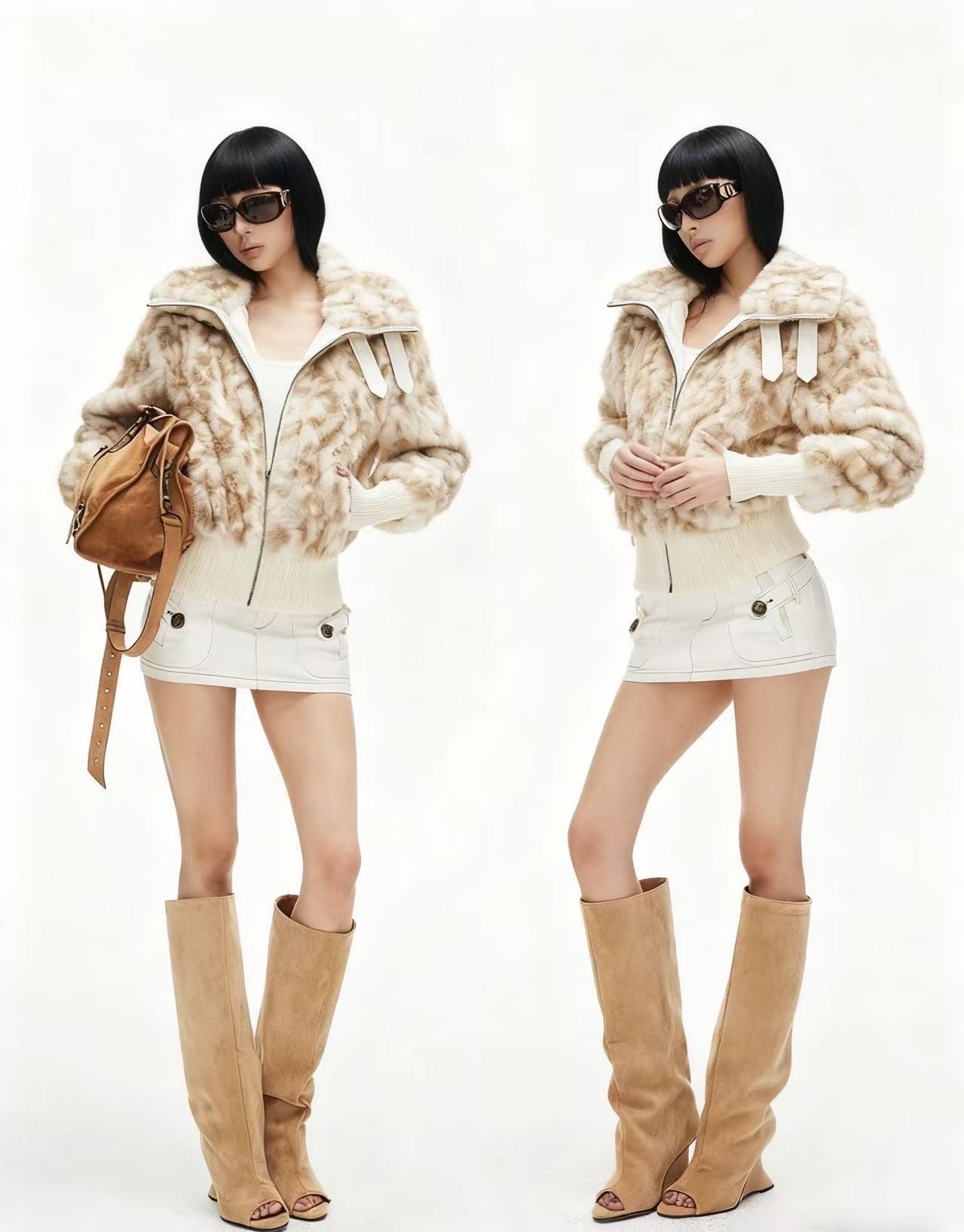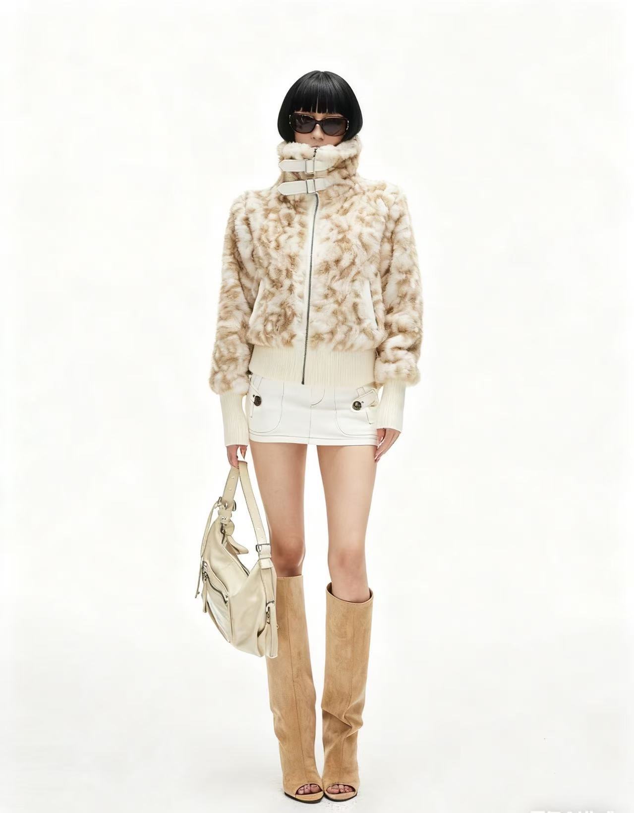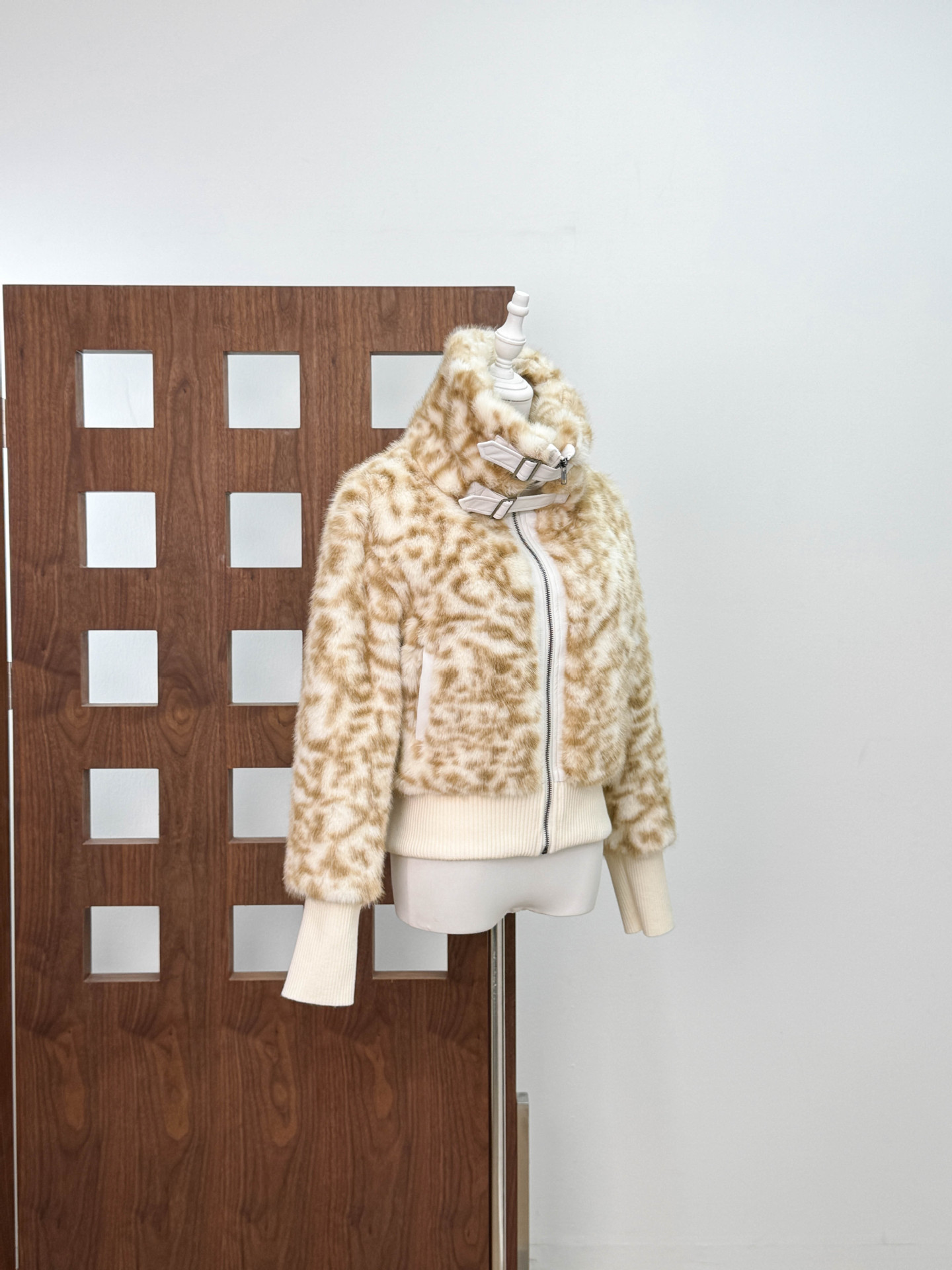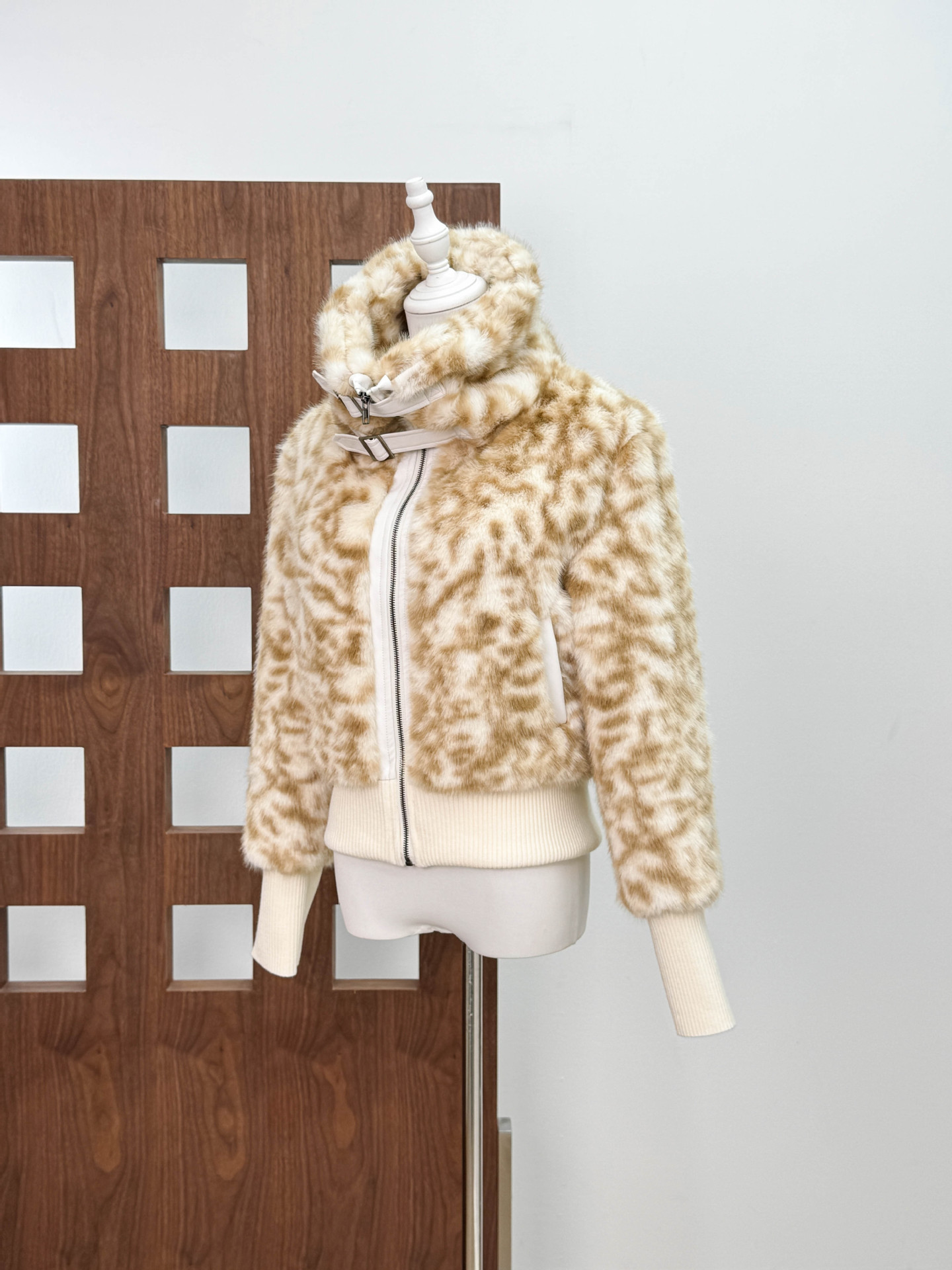 Environmentally friendly fur foldable stand up collar leather loop loose short jacket