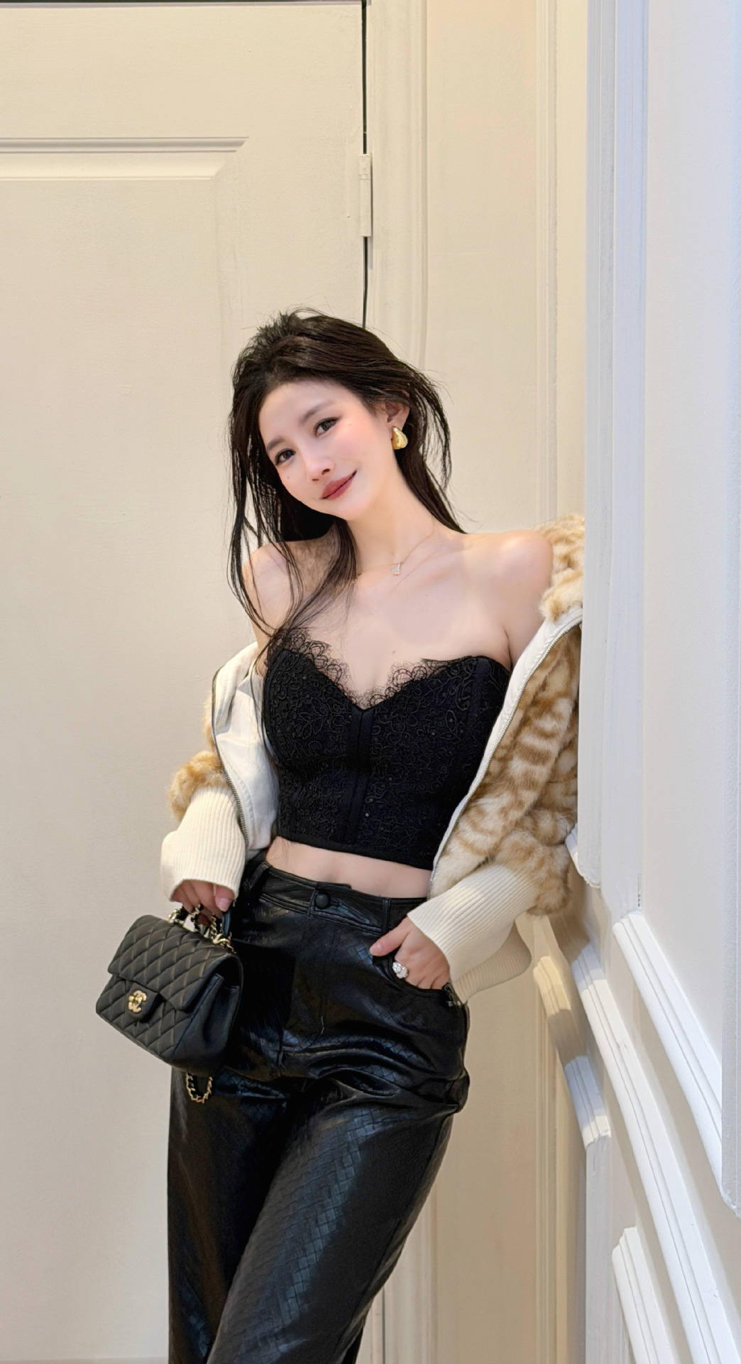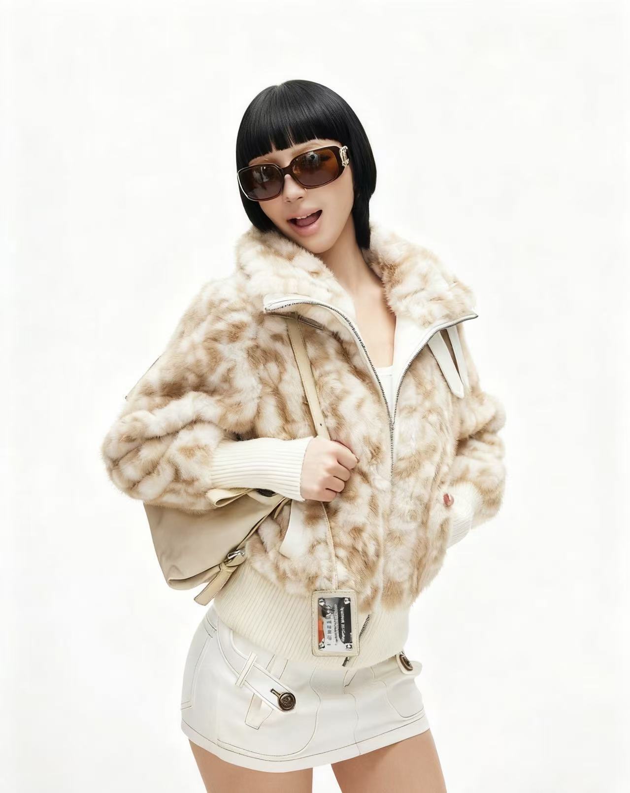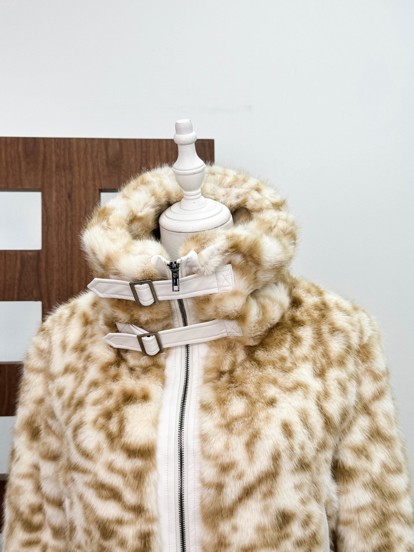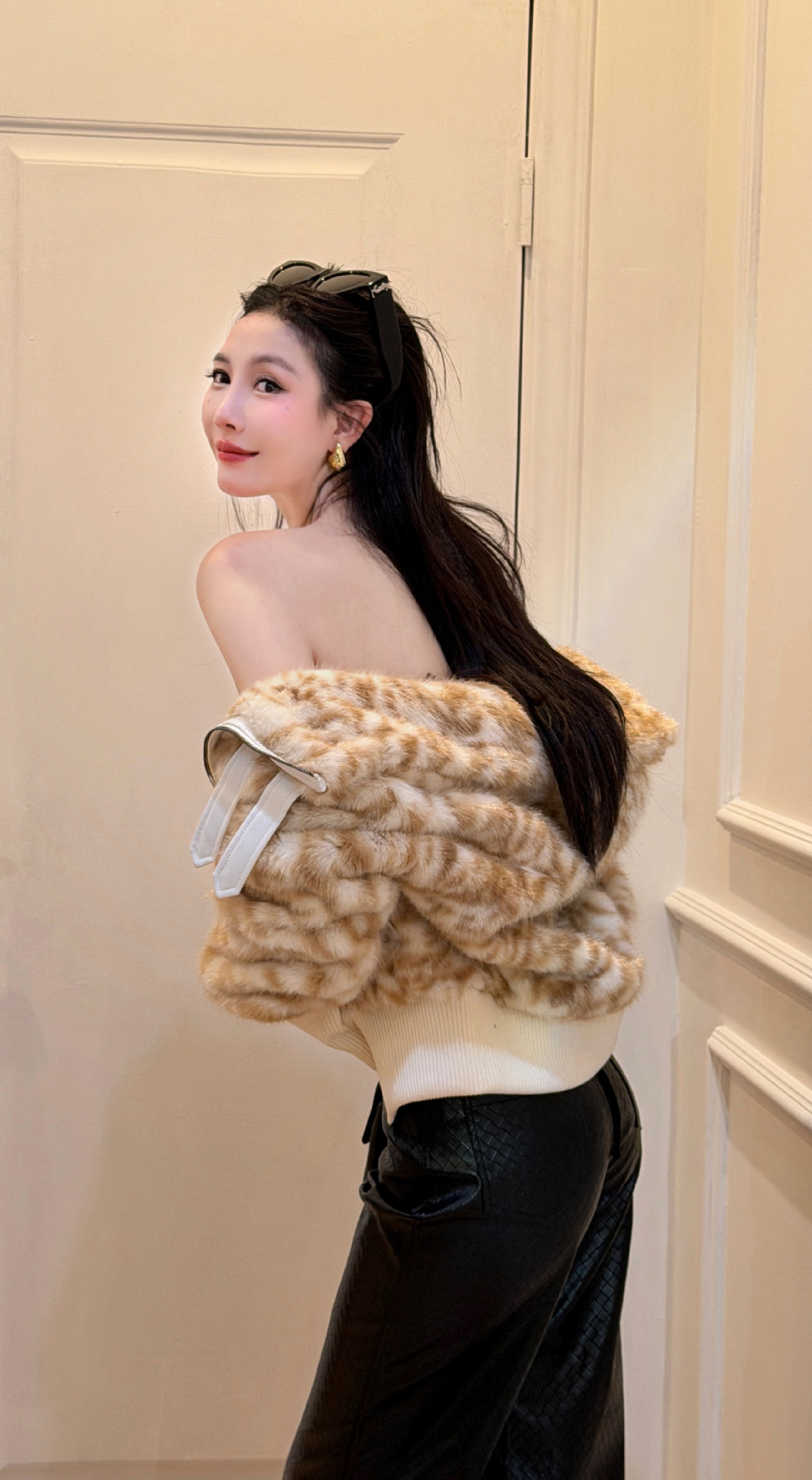 Environmentally friendly fur foldable stand up collar leather loop loose short jacket